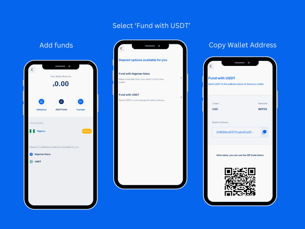 - From the available funding methods, select “Fund with USDT.”