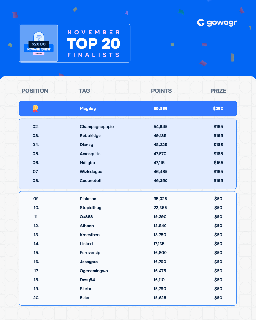 November was electric on Gowagr. For 30 straight days, traders across the community battled for a share of the $2,000 prize pool. The competition was tight, positions flipped daily, streaks were built, and every trade mattered.